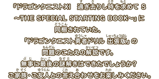 『ドラゴンクエストXI 過ぎ去りし時を求めて S 〜THE SPECIAL STARTING BOOK〜』に同梱されていた、「ドラゴンクエスト勇者ドリル 出張版」の問題のこたえの解説です。無事に最後の謎解きはできたでしょうか?ご家族・ご友人との答え合わせをお楽しみください。